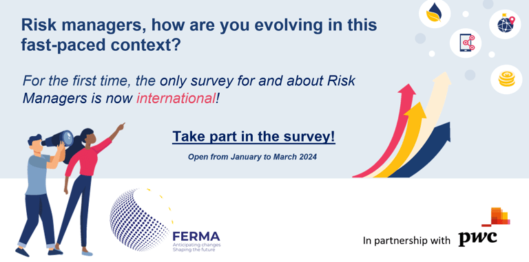 2024 m. sausio mėn. FERMA, bendradarbiaudama su „PwC France“ ir pirmą kartą istorijoje pasitelkdama tarptautinę rizikos valdymo bendruomenę, išleido naują rizikos valdymo profesijos apklausą po kurios atliks rizikos valdymo tyrimą. Šių metų ataskaitoje bus pateikti duomenys, surinkti padedant tiek FERMA narių, tiek mūsų partneriams JAV, Azijoje, Lotynų Amerikoje bei Afrikoje.